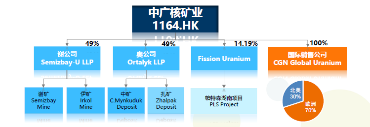中廣核礦業(yè)的主要業(yè)務(wù)是核能企業(yè)使用的天然鈾資源的開(kāi)發(fā)與貿(mào)易。公司目前持有資產(chǎn)包括: 1.哈薩克斯坦謝米茲拜伊鈾公司49%的權(quán)益和產(chǎn)品包銷權(quán)。 2.哈薩克斯坦奧爾塔雷克公司49%的權(quán)益和產(chǎn)品包銷權(quán)。 3.加拿大鈾礦勘探公司FissionUraniumCorp.14.19%的股權(quán),和20%的天然鈾產(chǎn)品包銷權(quán)以及額外15%的包銷選擇權(quán)。 3.中廣核國(guó)際鈾產(chǎn)品銷售有限公司100%的股權(quán)。